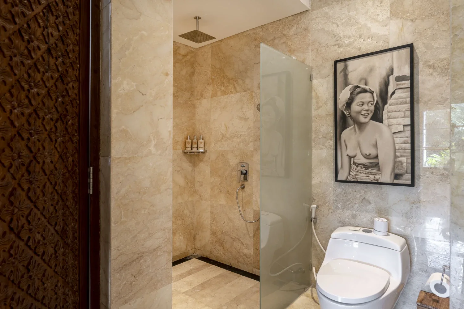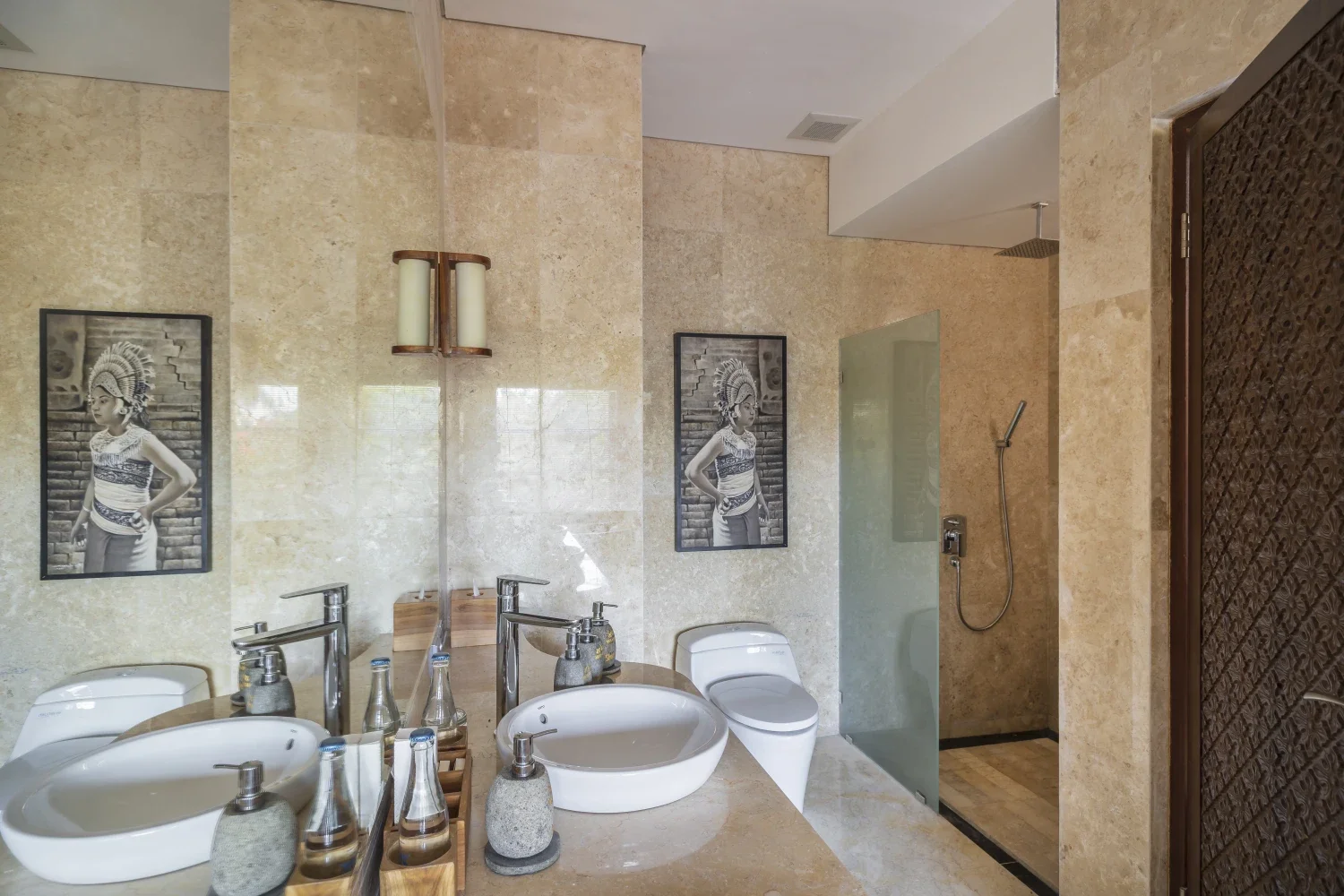 Each of the lavish 53m2 suite feature balconies and a sense of floating on tree canopies, spoiling you with panoramic views of lush surroundings. The comfortable interior ambiance ensures that your rejuvenating connection with nature remains at full strength. Enchanting Balinese style suites are elaborately furnished with carvings offering stunning views of the floating treetops equipped with other well thought amenities for guests. The spacious bathroom invites well-deserved moments of relaxation.