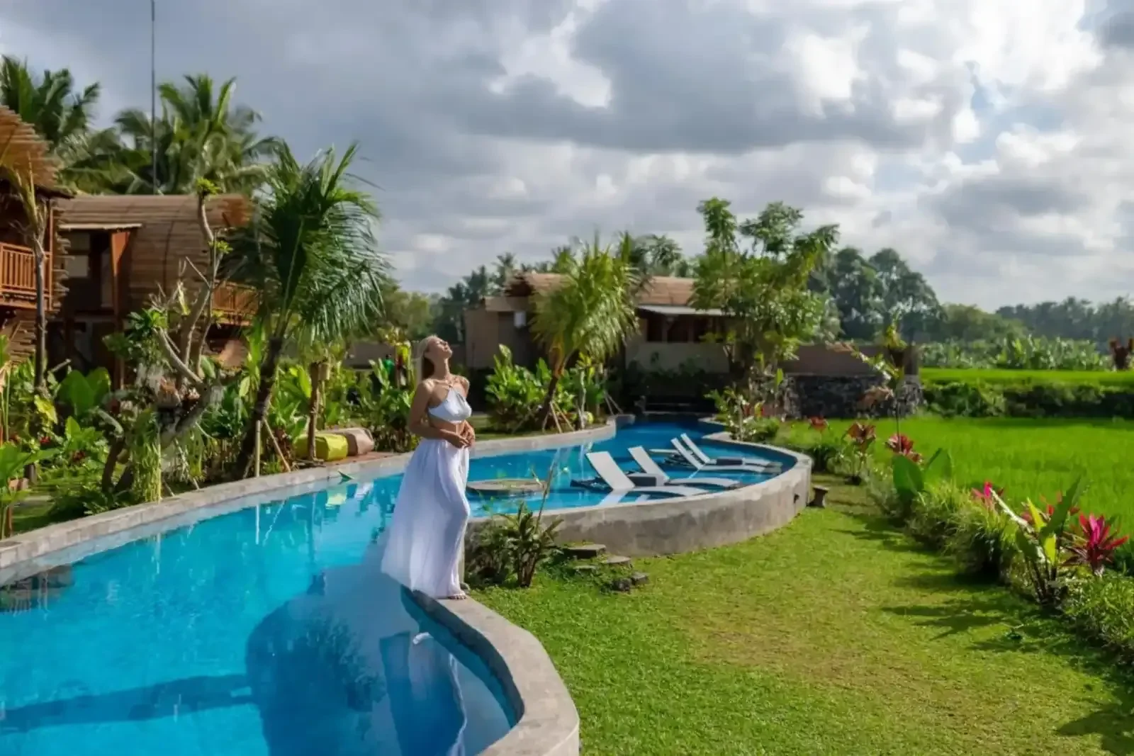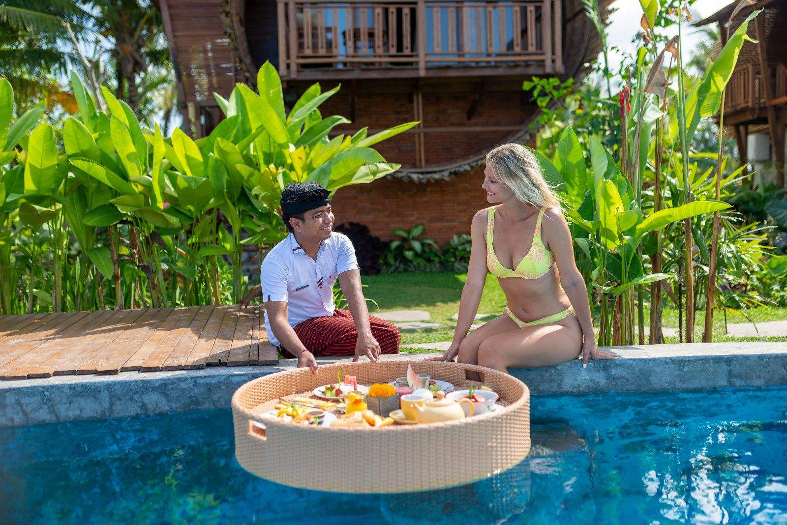 Come stay at Bee House Dijiwa Ubud and you will enjoy our stunning pool as far as the eye can see. The main pool is designed in the shape of a lagoon that stretches across the area. This is aligned with the concept of a water source or an oasis that always surrounds Balinese houses. The pool is curvy, blue, and it invites guest to cool off while basking in the beautiful rice terrace view. Bee House Dijiwa Ubud offers comfortable lounge chairs for those who seeks to sunbathe or simply relax and watch the birds playing amongst the rice paddies. Refreshing beverages and scrumptious snacks are available too.